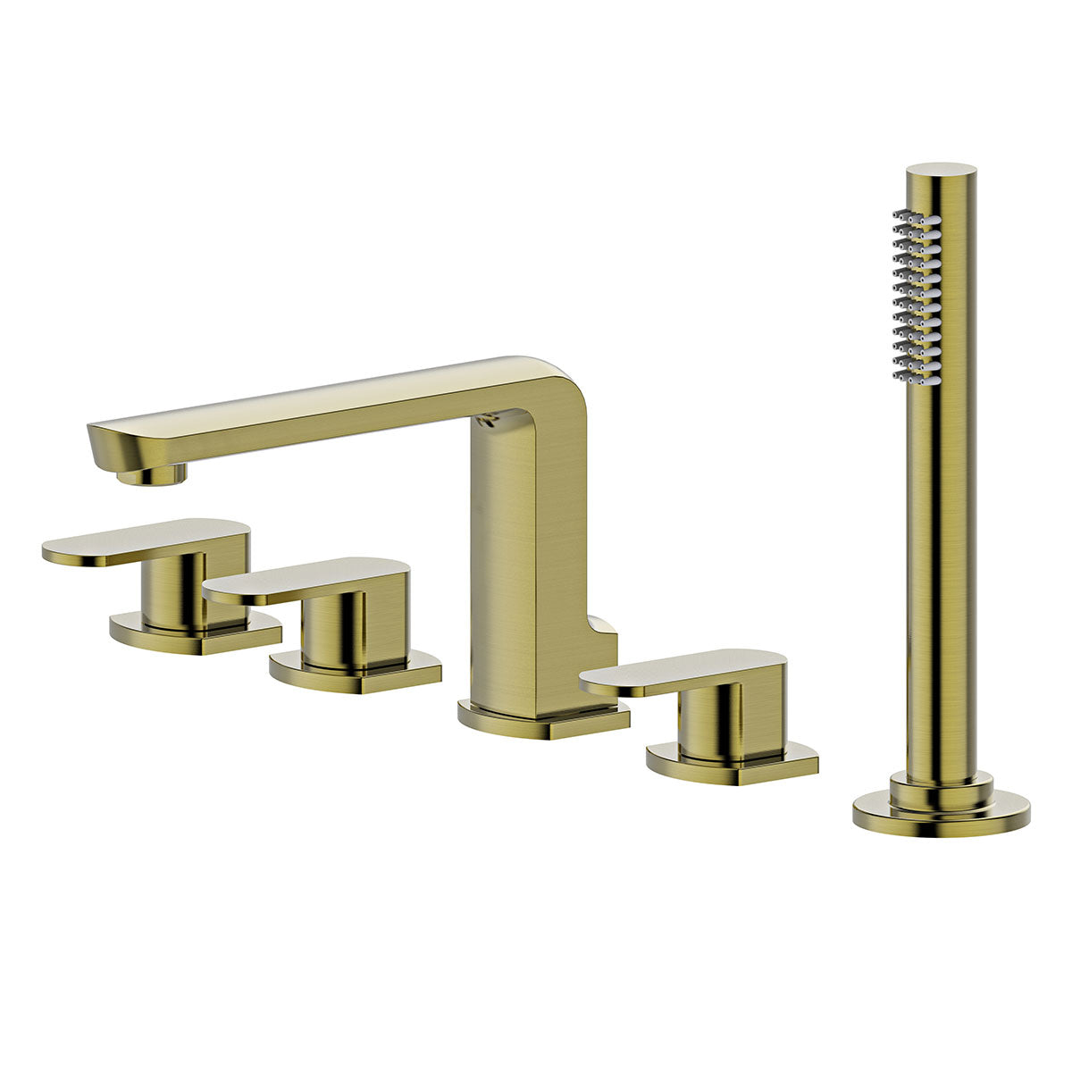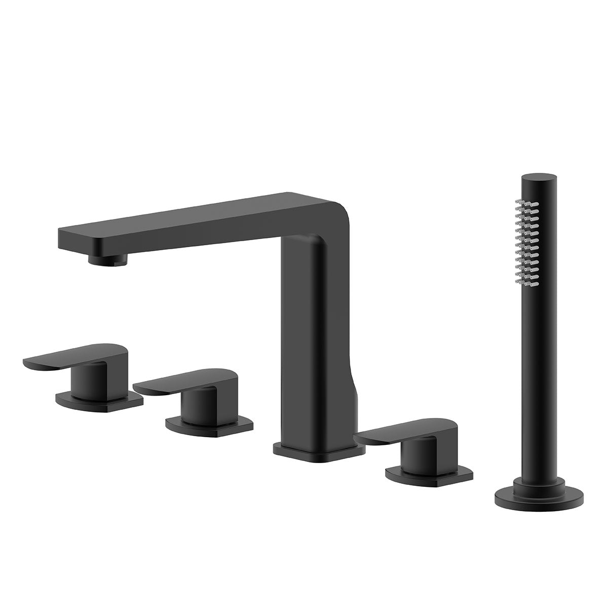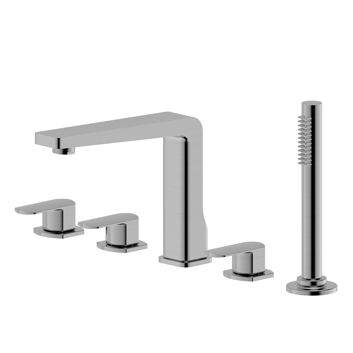 Modern design for luxury bathing; cast brass tall spout and ceramic disc valving for durability and a lifetime of drip-free performance; diverter valve changes water flow from tub spout to convenient hand spray for extended reach and rinsing.
