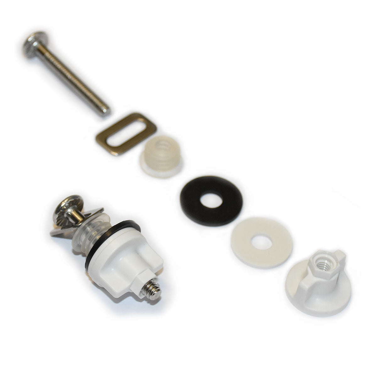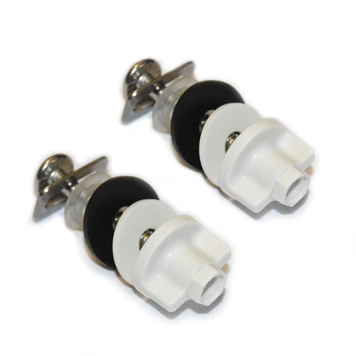 Parts (2 each): Stainless steel screws (1/4 in. thread), clear ribbed inserts, black rubber washers, white plastic washers and white plastic wing nuts.