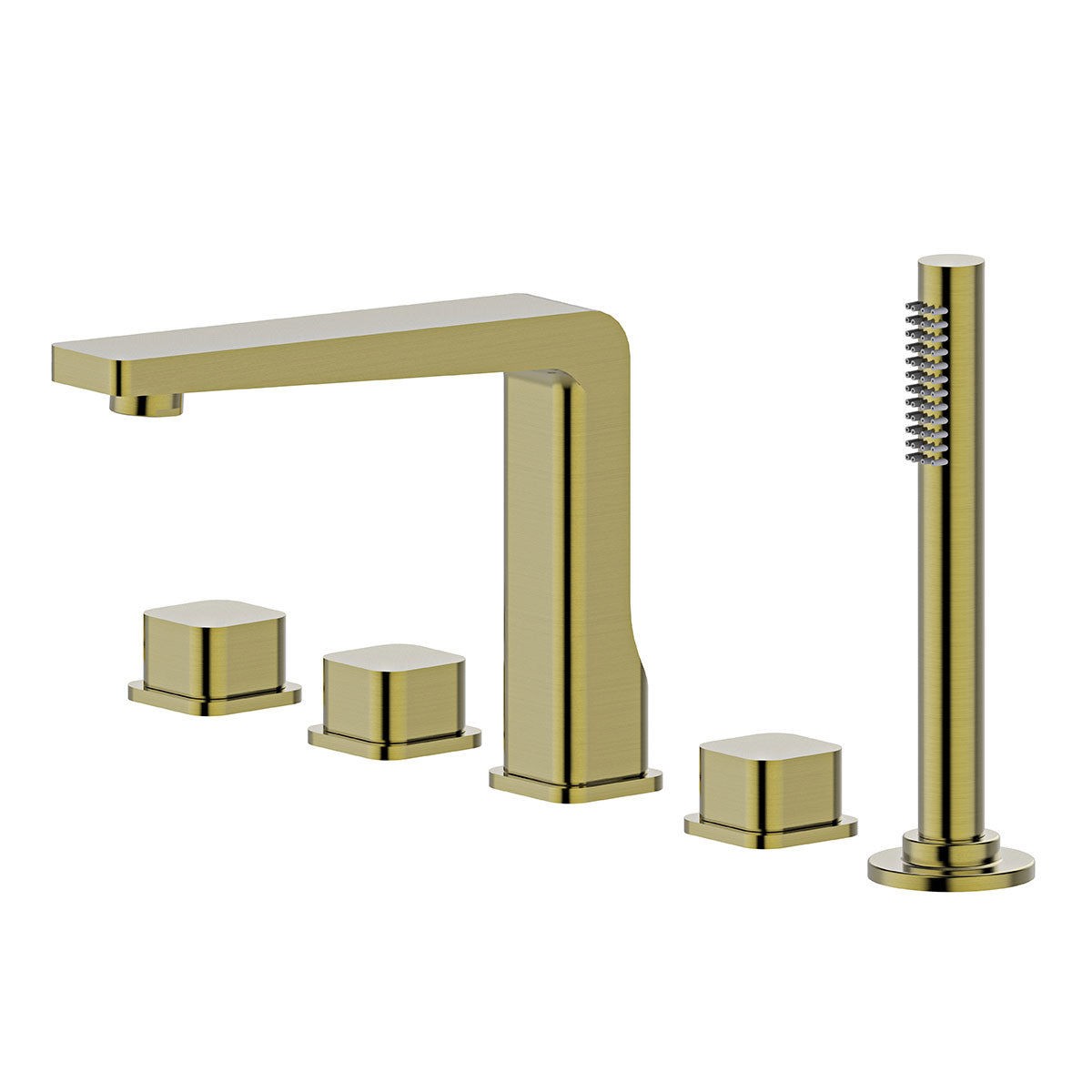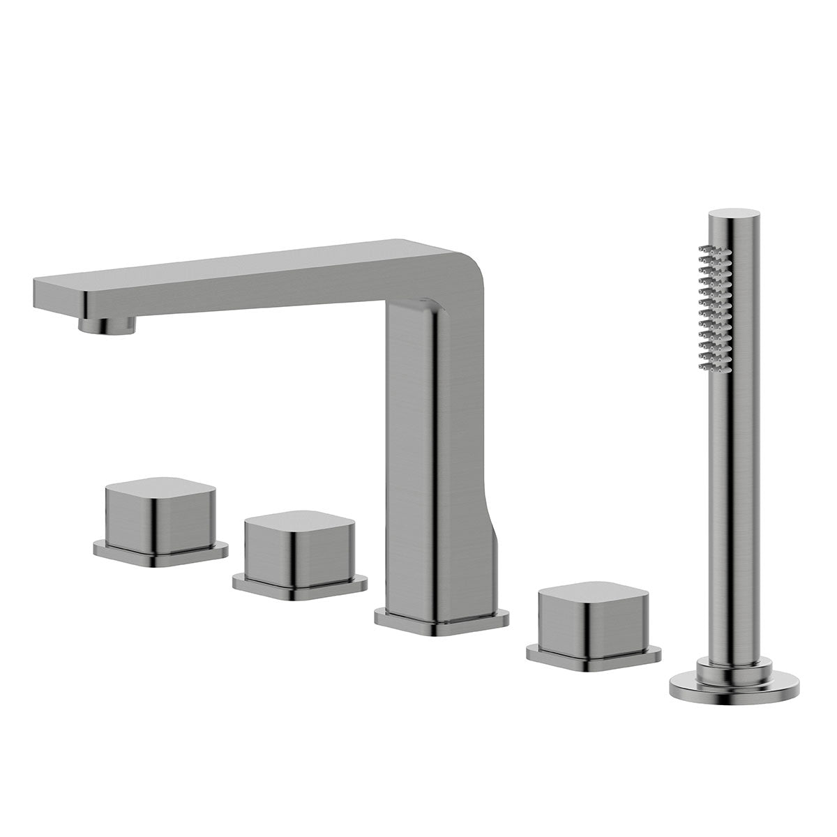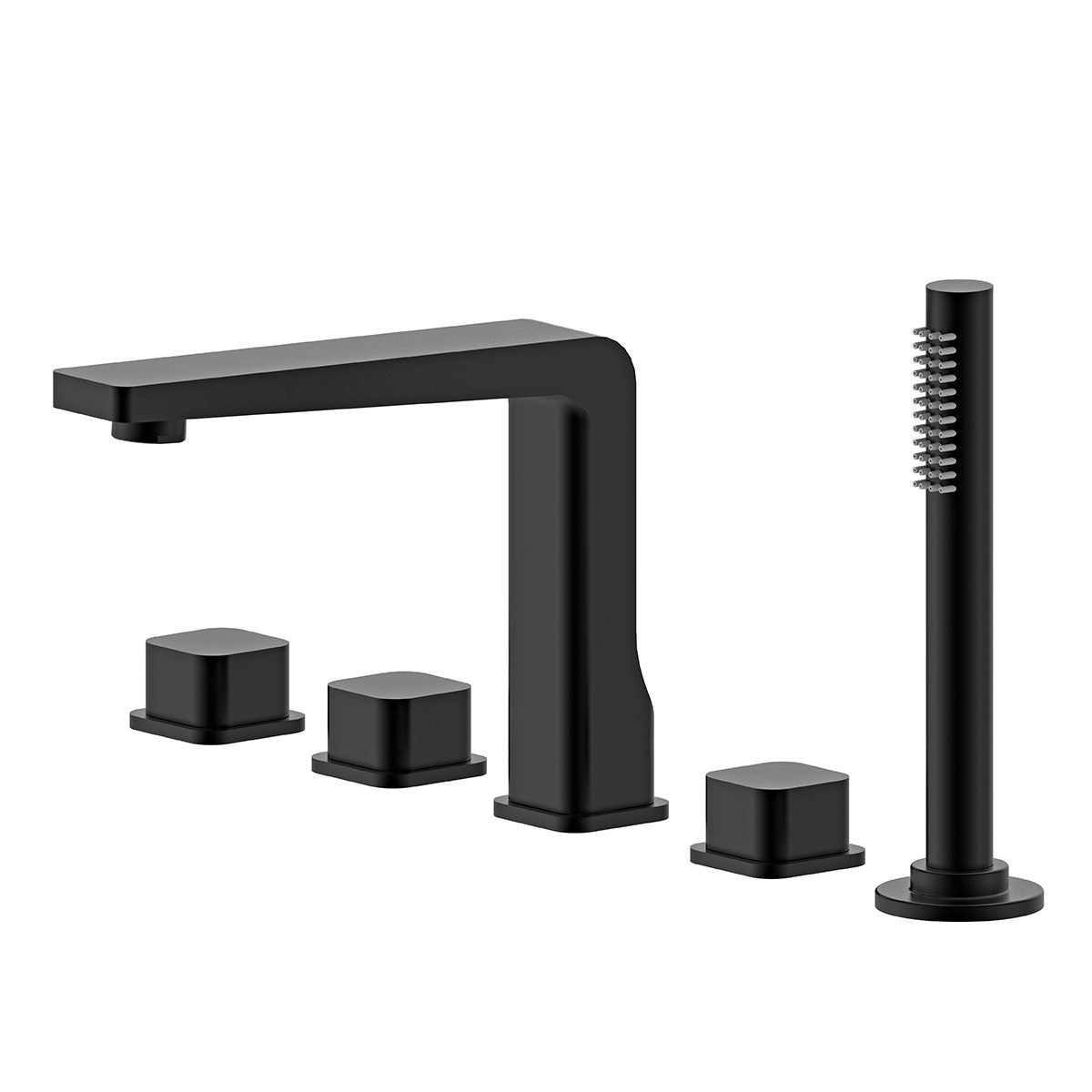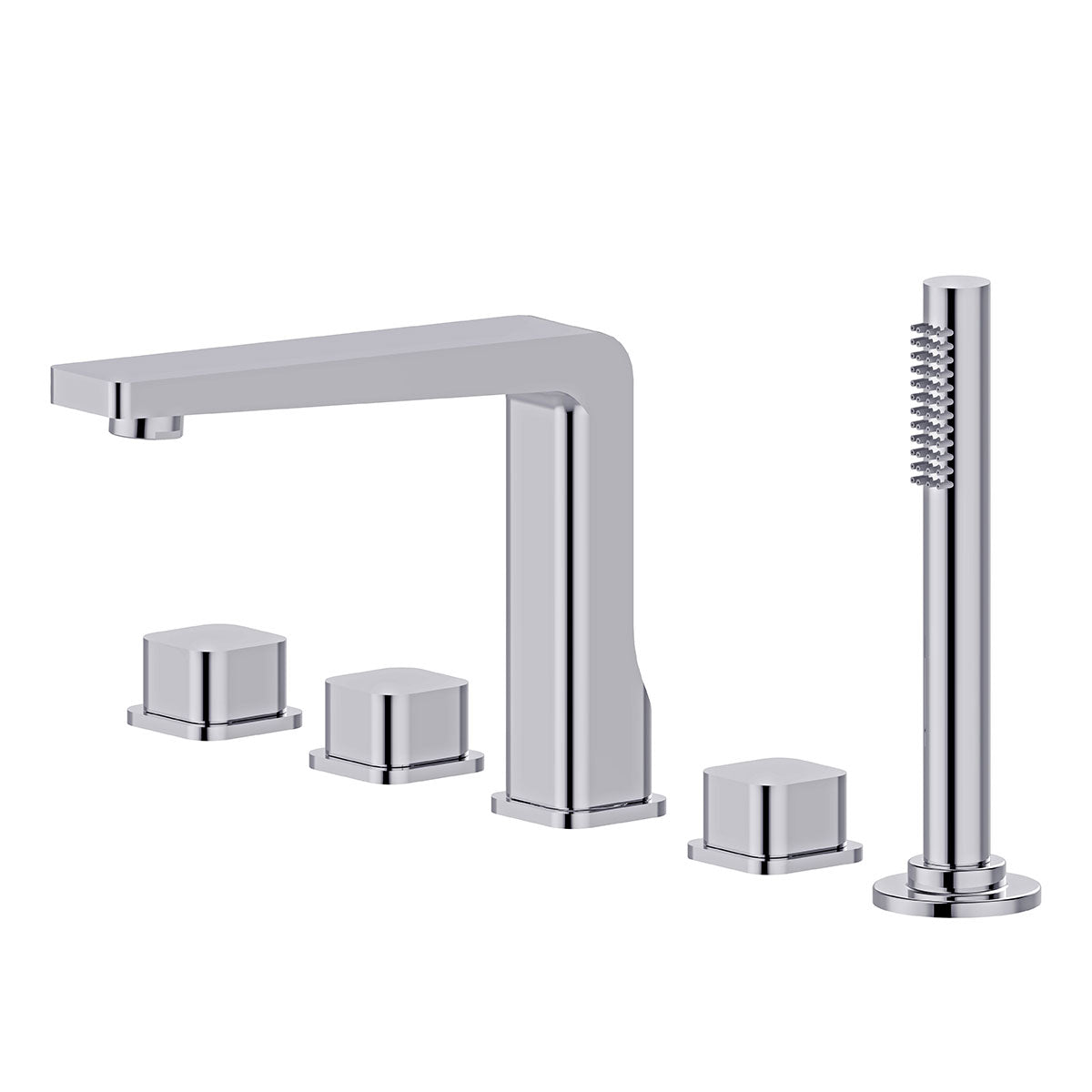 Modern design for luxury bathing; cast brass tall spout and ceramic disc valving for durability and a lifetime of drip-free performance; diverter valve changes water flow from tub spout to convenient hand spray for extended reach and rinsing.